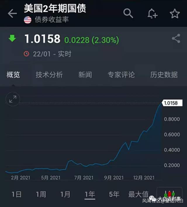 而且,2年期收益率飆漲到1%,基本意味着市場預期美聯儲今年至少會加息100個基點到1%。