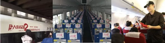 **《唐人街探案2》**在高鐵做廣告、上飛機撒幣,走海陸空全覆蓋的路線,在包括北京、上海、廣州、深圳、重慶、廈門等城市的300多次和諧號動車上刷廣告,直接觸達人羣超過百萬;導演陳思誠更曾登上飛機,直接給乘客發紅包。加之在南京、福州、杭州、東莞、佛山等26個城市進行的路演,參加湖南、江蘇、浙江等5大衞視共8檔綜藝節目,在全國230多個萬達廣場中加入《唐探2》的元素……最終將《唐人街探案》系列的票房從不足10億,送入30億大門。