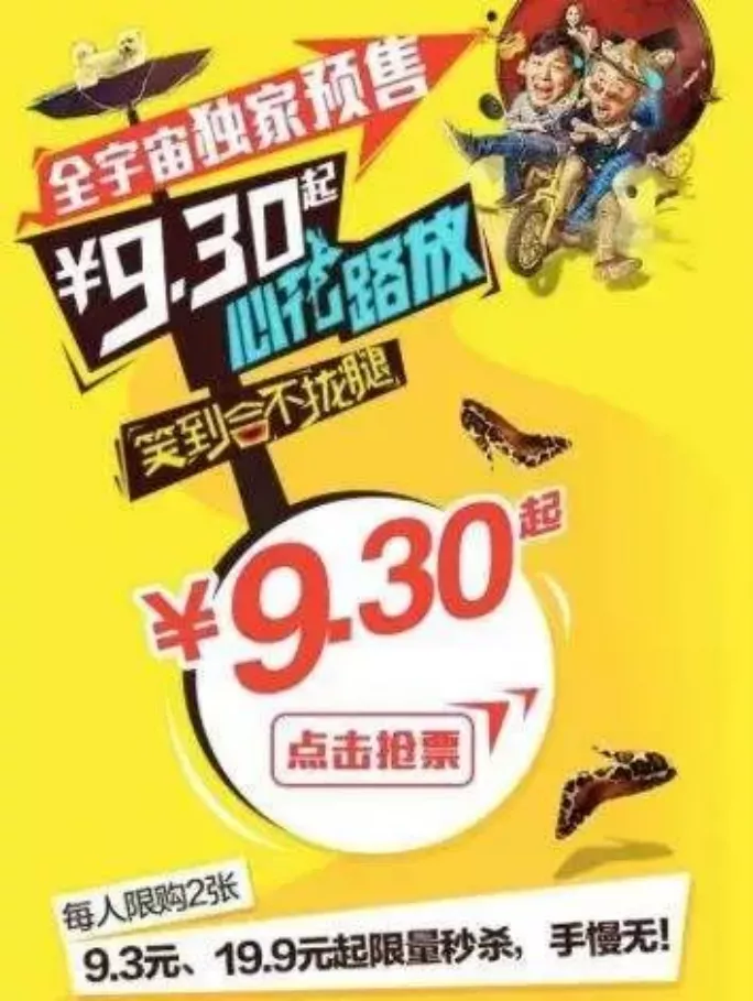 **春節檔曾是票補大戰的最佳試煉場。**2017年春節檔前夕,貓眼推出“貓眼派對,一期一惠”活動,《西遊伏妖篇》《功夫瑜伽》《大鬧天竺》《乘風破浪》《熊出沒·奇幻空間》5部新片均能享受9.9元的優惠價格。淘票票不甘落後,除《熊出沒·奇幻空間》外,新片都享受“8.8元起過大年”。格瓦拉則聯手銀行,針對《乘風破浪》發起“5元電影票”。