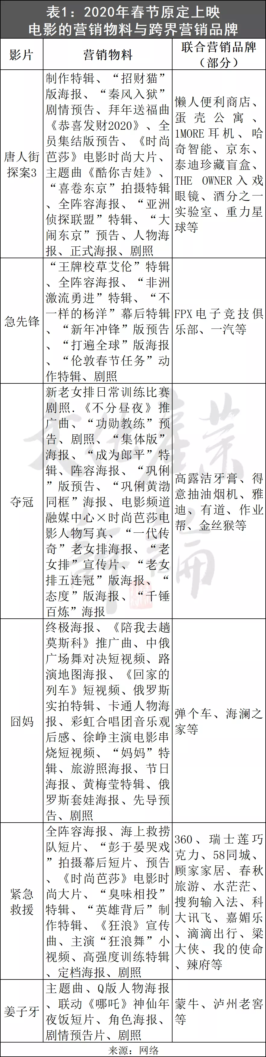 **2019年的春節檔,延續了這種大力出奇跡的方式。**2020年撤檔前的春節檔,在營銷上也沒手軟,宣傳物料的種類和數量更多,品牌聯合營銷更上一層樓。