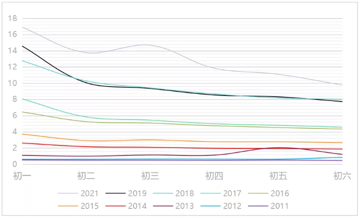 △圖2:2011-2021年春節檔走勢圖 單位:億元(數據來源:貓眼專業版)