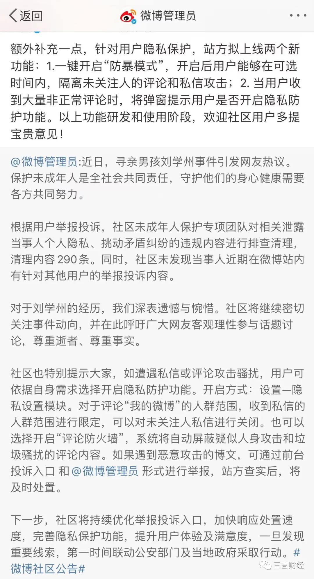 今日晚,微博管理員就“劉學州遭到網暴”一事發文稱,根據用户舉報投訴,社區未成年人保護專項團隊對相關泄露當事人個人隱私、挑動矛盾糾紛的違規內容進行排查清理,清理內容290條。同時,社區未發現當事人近期在微博站內有針對其他用户的舉報投訴內容。