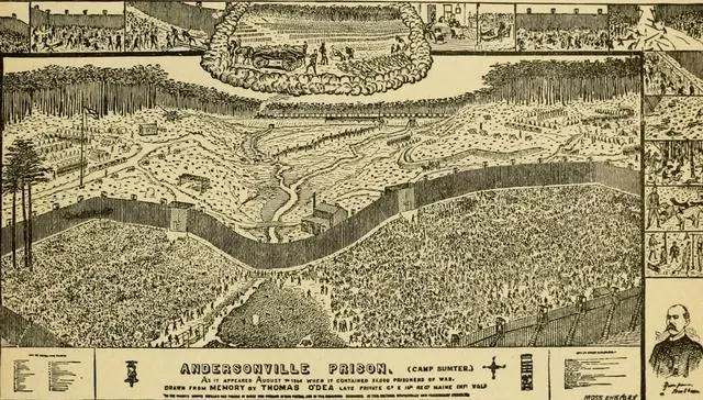 而南軍這邊當然不會“以德報怨”,他們採取更為殘酷的手段虐待北軍俘虜,比如在佐治亞州一處名為安德森維爾的地方,曾建立了一座佔地27英畝的巨大戰俘營,從1864年2月第一批俘虜到達以來,僅僅數個月就關押了4.5萬名北軍俘虜。