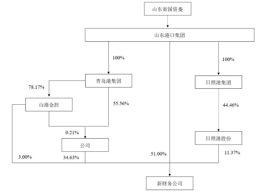 本次重組整合完成前,公司對青島港財務公司的持股比例為70%;本次重組整合完成後,公司對新財務公司的持股比例為34.63%,新財務公司將不再納入公司合併報表範圍。截至本公告日,根據《山東省港口集團有限公司與青島市人民政府國有資產監督管理委員會關於山東港口青島港集團有限公司51%股權之無償劃轉協議》,山東港口集團將持有青島港集團100%股權,成為公司的間接控股股東;日照港股份為山東港口集團的間接控股子公司;山港金控為青島港集團的控股子公司。