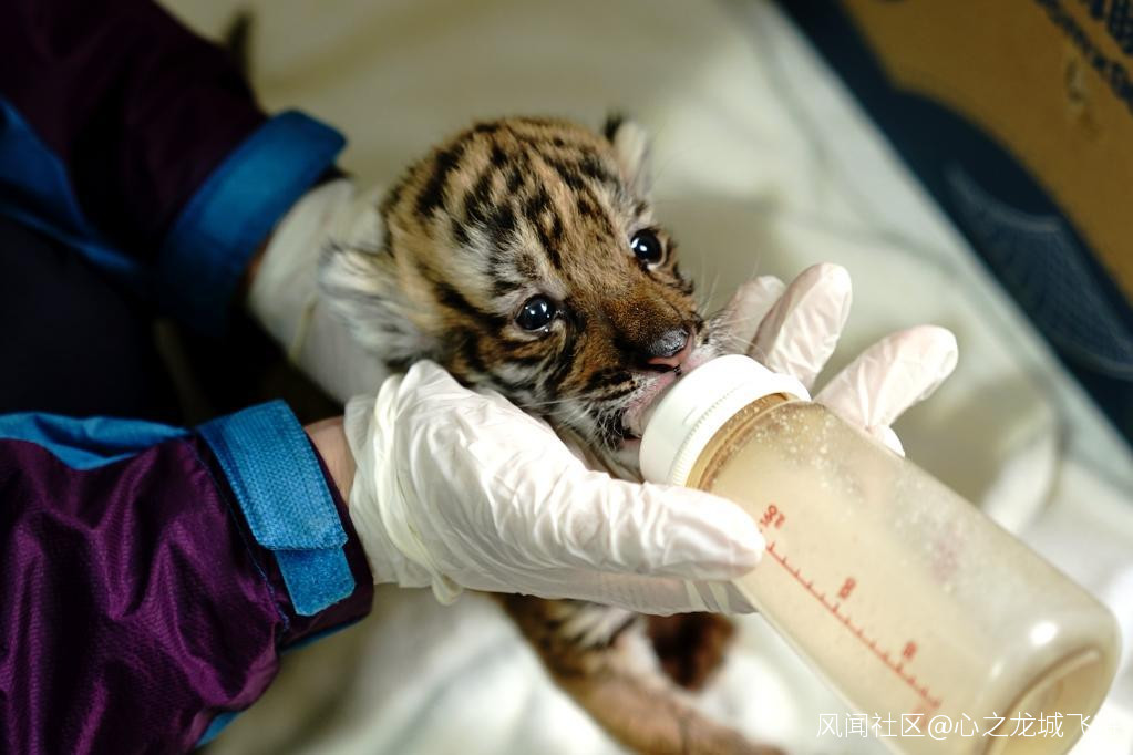 2021年12月24日,上海動物園飼養員給一隻華南虎幼崽餵奶。新華社記者 張建松攝