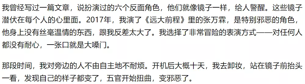 我演任何角色心裏必須得有,心裏沒有,我演不出來,他那種攻擊性,那種惡,就是你心裏必須裝着惡,從你心的箱子底翻出來,還得保護住這種惡,對我來説多麼殘酷啊。