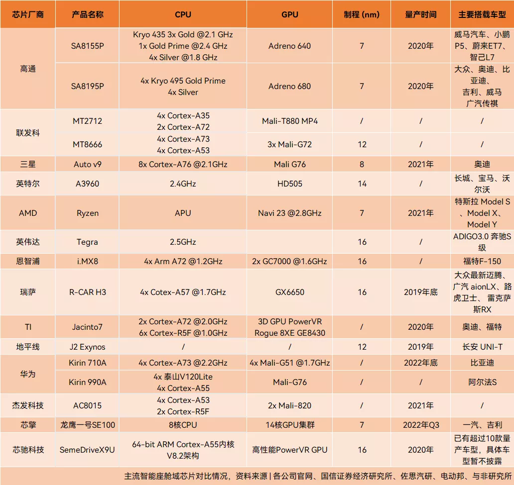 智能座艙SoC領域,國外巨頭佔據主要市場,國產芯片從2019年開始陸續量產。與傳統模擬芯片、電源管理芯片、MCU的國產替代思路不同,車載系統在打造流暢交互操作的同時,算力需求也在擴張,國內新晉企業普遍採用新技術和工藝,以取得最佳的性能。