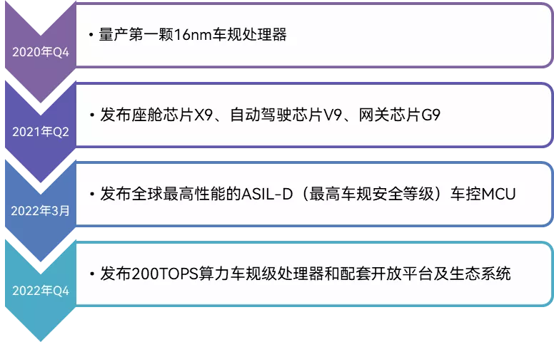 智能駕駛V9系列是基於機器視覺和人工智能的高級輔助駕駛和自動駕駛系列芯片,2023年將會推出面向L4/L5應用的500~1000 TOPS(處理器運算能力單位)算力芯片。
