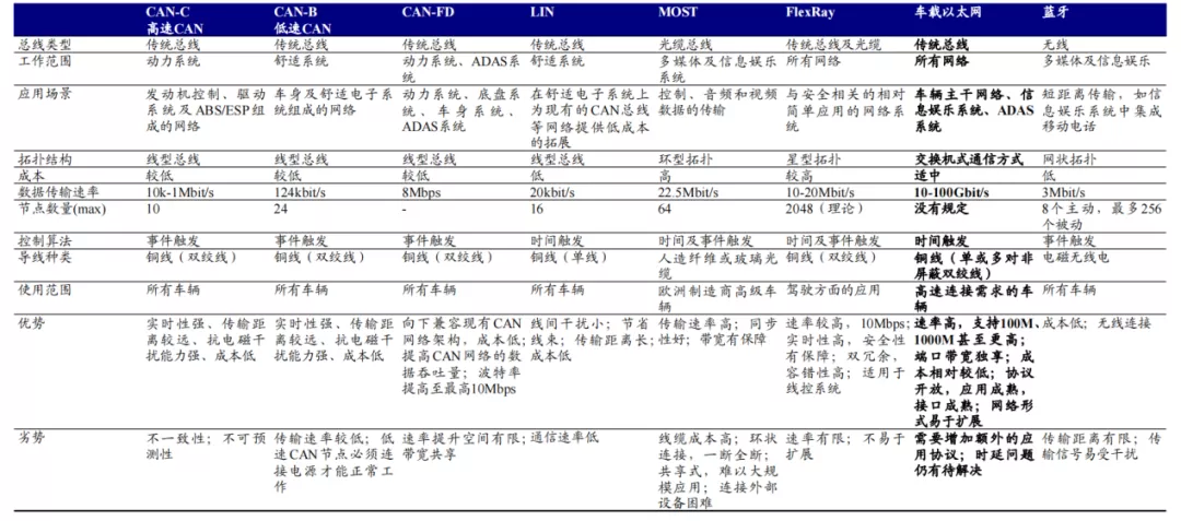 汽車智能化使得系統日益複雜,車內則以總線(連接不同部件的信息傳送公共通路)形式承載龐大的通信需求。車內總線包括CAN、CAN-FD、LIN、藍牙、車載以太網等,不同區域使用總線類型不同。