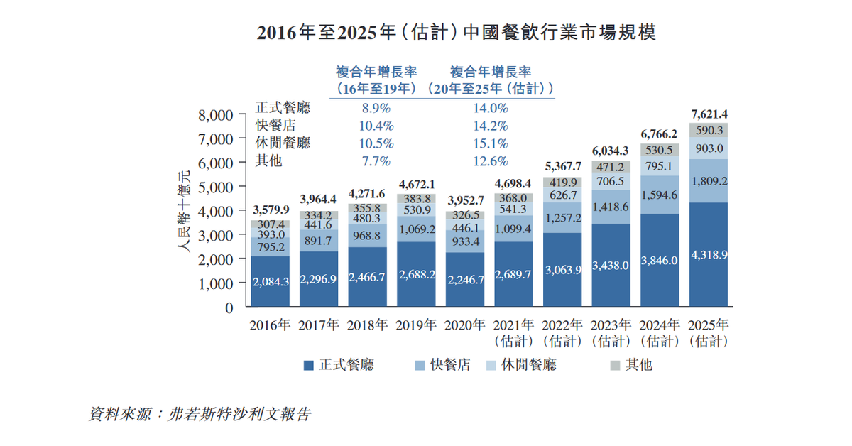 根據弗若斯特沙利文報告,但按餐飲市場規模計,且中國的餐飲市場預計將於2021年起在未來數年內恢復,從2020年的人民幣39,527億元增加至2025年的人民幣76,214億元,複合年增長率約為14.0%,中國的快餐店市場預期將進一步增長,於2025年達到人民幣18,092億元。