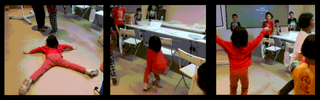 那要怎麼認識它們呢?孩子們就來扮演這些動物,去感受動物的狀態。這是一個特別有活力的小朋友,最左邊的這個,她説是海龜,中間和右邊那個,她説那是水母,孩子們的想象力真的很可怕。
