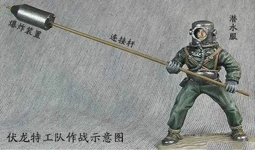 這些蛙人被日本海軍稱為 “伏龍”,他們配備了潛水服和竹竿末端的小型水雷。他們被部署在從水下的掩體中,向水下的登陸艇走去。他們通過提供液化食物的管子進食,並攜帶足夠進行幾個小時的活動的空氣。當登陸艇從頭頂經過時,他們把一端綁着水雷的杆子向上推,在登陸艇底部引爆,爆炸也會殺死潛水員自己。