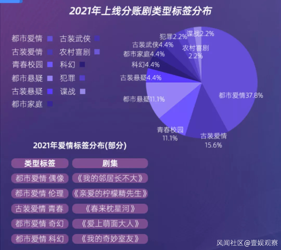 優酷分賬劇方面,首先在類型細分化上大舉邁步。2021年,優酷分賬劇在都市愛情、古裝愛情和青春校園的常見題材之餘,題材進一步細分化,並且覆蓋平台大劇集所缺少的類型選題。