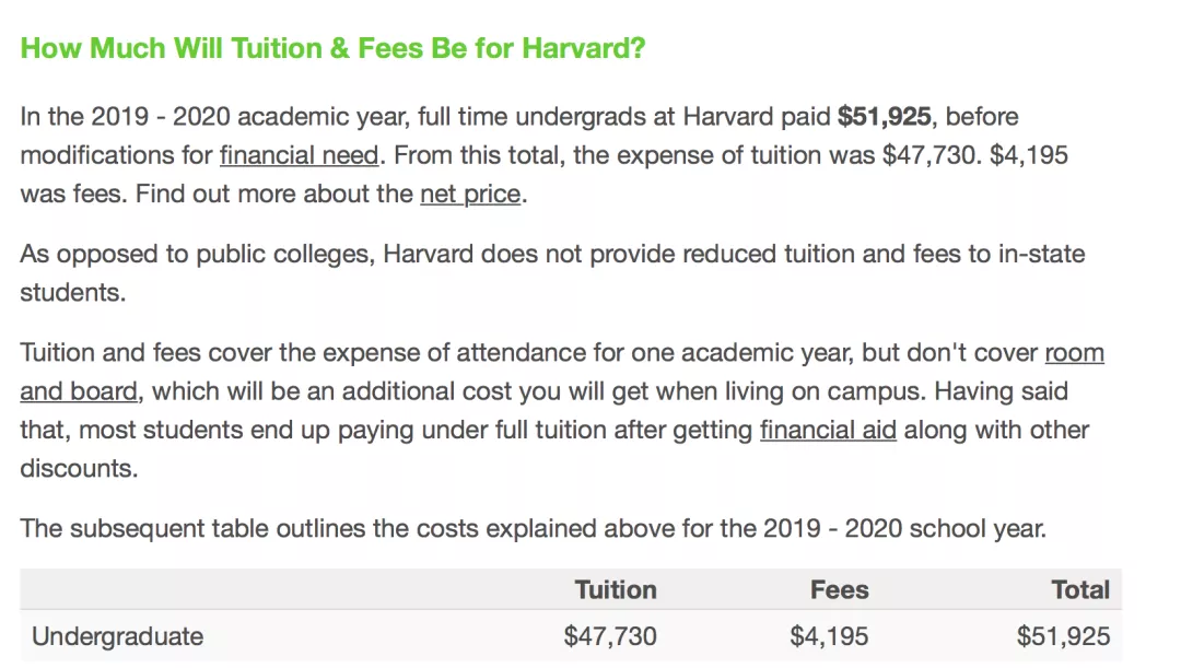 在網站中搜索自己目標院校的名字後,點擊查看cost即可瞭解該學校一年所需花費。拿哈佛大學舉例子,本科學生一年的學費是$51,925,其中不包括住宿費。