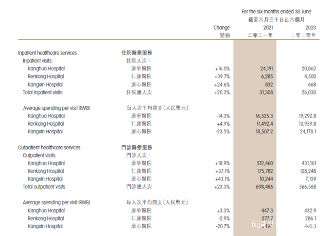 截至2021年上半年,康華醫院門診人次為51.25萬次,較去年同期增加18.9%;住院人次為2.42萬次,較去年同期增加16.0%。康華醫院住院醫療服務中,每人次平均開支1.65萬元,同比減少14.3%;門診醫療服務每人次平均開支447.3元,同比增長3.3%。