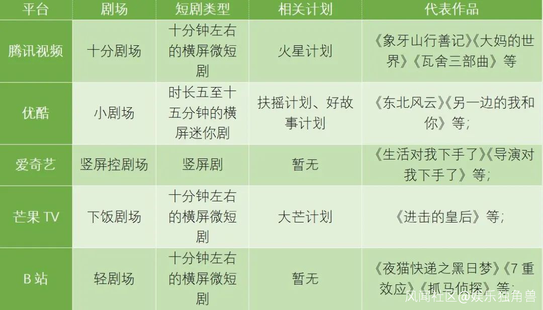 而長視頻平台對於短劇的定義更加多元化,豎屏短劇之外,優愛騰芒B主要發力的是時長較短、題材更垂直的橫屏劇集。如2018年愛奇藝推出以豎屏劇為主的“豎屏控劇場”、騰訊視頻與yoo視頻(後改名“火鍋視頻”)也上線了一系列豎屏劇等,但大部分是橫屏短劇劇場。近日騰訊視頻官宣了“十分劇場”,而這之前優酷有自己的“小劇場”,推出迷你劇,芒果TV推出了“下飯劇場”,B站上線了自己的“輕劇場”。