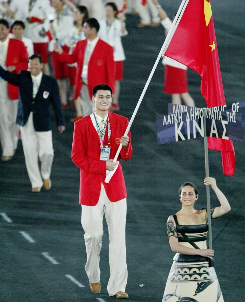 2004年,雅典奧運會開幕式,中國代表團旗手姚明揮舞五星紅旗入場。(圖片來自網絡)