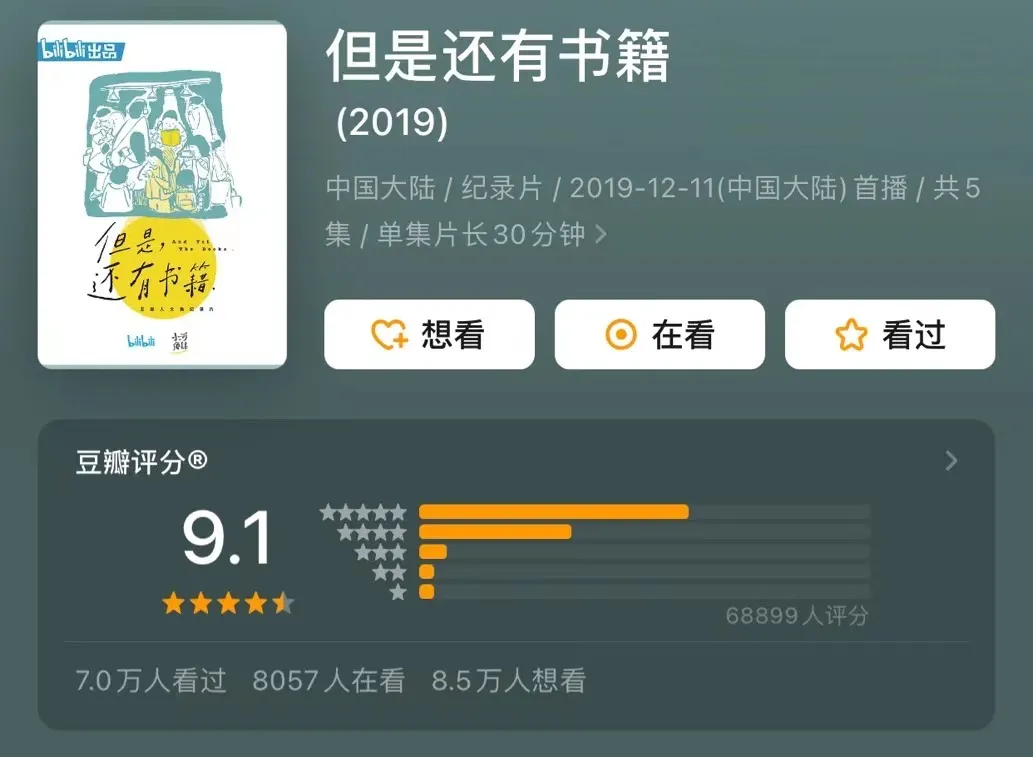 2019年,由B站和小河傳媒聯合出品的人文類紀錄片《但是還有書籍1》也在冬天上線,以5集的體量講述了十餘個關於寫書人、做書人、愛書人、讀書人的故事。最終,《但是還有書籍1》在B站收穫了超過1500萬的播放量和9.1的豆瓣評分,並且獲得了“第30屆中國電視金鷹獎”最佳電視紀錄片獎。