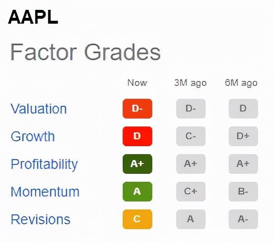 整體量化評級不是因素等級的簡單平均。為了最大化量化評級的預測價值,某些因素的權重高於其他因素。如果一隻股票在一個因素上得分非常低,則它被取消資格,因為它高於中性(持有)。不合格等級是增長、動量和每股收益修正的D+ 或更差,以及價值和盈利能力的 D- 或更差。就蘋果而言,該股票的估值為F級,增長為D級。基礎指標的所有等級的評分不均等。