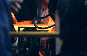 如果連鑄和熱軋是兩個相互獨立的工序,那麼連鑄坯冷卻後需要在熱軋前重新加熱(一般要加熱到1200℃左右,加熱時間以小時計),這顯然會增加能耗(下面動圖是板坯從加熱爐中取出,進行往復粗軋初步減薄的過程,之後還要進行連續的精軋得到薄鋼板,詳見面朝大海,金石為開——走進首鋼京唐(下))。因此,一個很自然的想法是利用連鑄鋼坯的餘熱,直接進行熱軋(為了保證熱軋時鋼坯的温度均勻、恆定,從連鑄機出來的鋼坯還是要先進過均熱爐加熱)。這就是連鑄連軋。