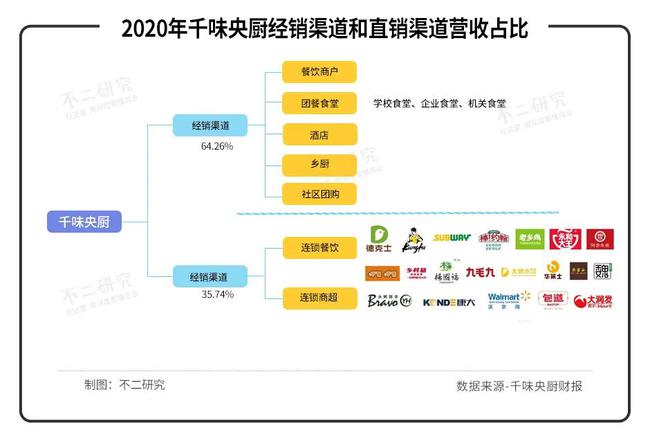 而千味央廚則專注B端市場。以直銷渠道綁定大B客户,經銷渠道下沉中小餐飲客户。在直銷渠道方面,千味央廚主要銷售定製產品給連鎖餐飲及連鎖商超等大B客户,百勝中國、華萊士、九毛九、真功夫、海底撈等均為其客户。經銷渠道則多為通用產品,主要依託經銷商對餐飲商户、團餐食堂、酒店、鄉廚等終端客户進行銷售。2020年經銷渠道和直銷渠道佔其營收的比例分別為64.26%和35.74%。