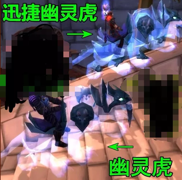 而一般所説的幽靈虎坐騎,分為“迅捷幽靈虎”和“幽靈虎”兩款,曾經因為品質不同而有速度差異,在移速由騎術決定之後,只有外觀上的區別:前者鞍座更豪華、腳腕上有盔甲,俗稱“大虎”;後者缺少這些裝飾的部分,一般稱作“小虎”。