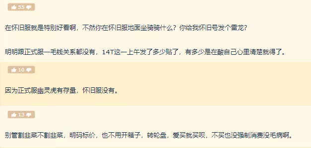 幽靈虎的“直售”在今天引起了大量玩家的討論,有玩家指出幽靈虎特別禮包1688元的售價遠高出以往商城直售坐騎的價格(通常不會超過400元),且對花高價購買幽靈虎的玩家並不公平;但在另一些玩家的視角里,幽靈虎僅限懷舊服綁定單個角色使用,而懷舊服本身就沒有幽靈虎存量,並不會傷害到已有幽靈虎玩家的利益——至於價格問題,“嫌貴可以不買嘛”。