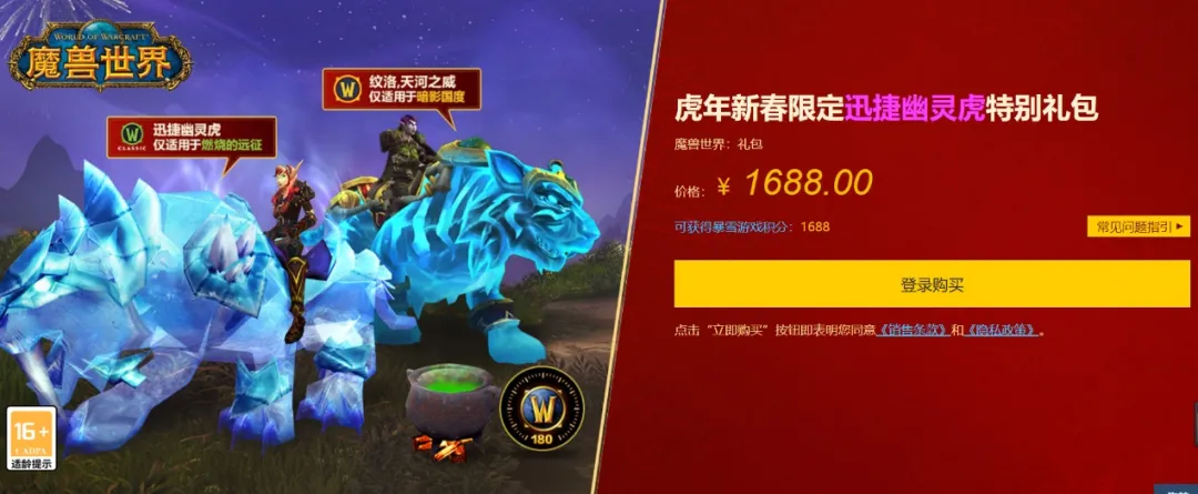 這個在虎年新春時間限定發售(1月26日-2月28日)、價格1688元的特別禮包,包含180天遊戲時間、虎年紀念坐騎“紋洛,天河之威”(正式服可用)、“地精雜燴煲”玩具(TBC懷舊服可用)以及迅捷幽靈虎坐騎(TBC懷舊服可用)。