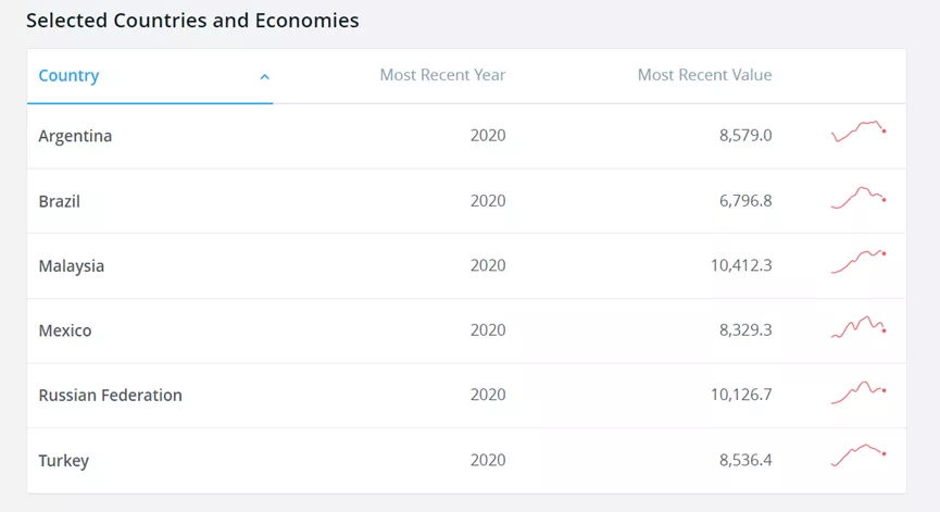 我們熟知的那些主要發展中國家大國,全部都遭遇了一萬美元現象,下圖是我在世界銀行官網截取的,俄羅斯,馬來西亞,墨西哥,土耳其,阿根廷,巴西,他們全都至少曾經人均超過一萬美元,但是後面又跌回去了或者説停滯不前,2020年的疫情只是讓這個情況雪上加霜而已。
