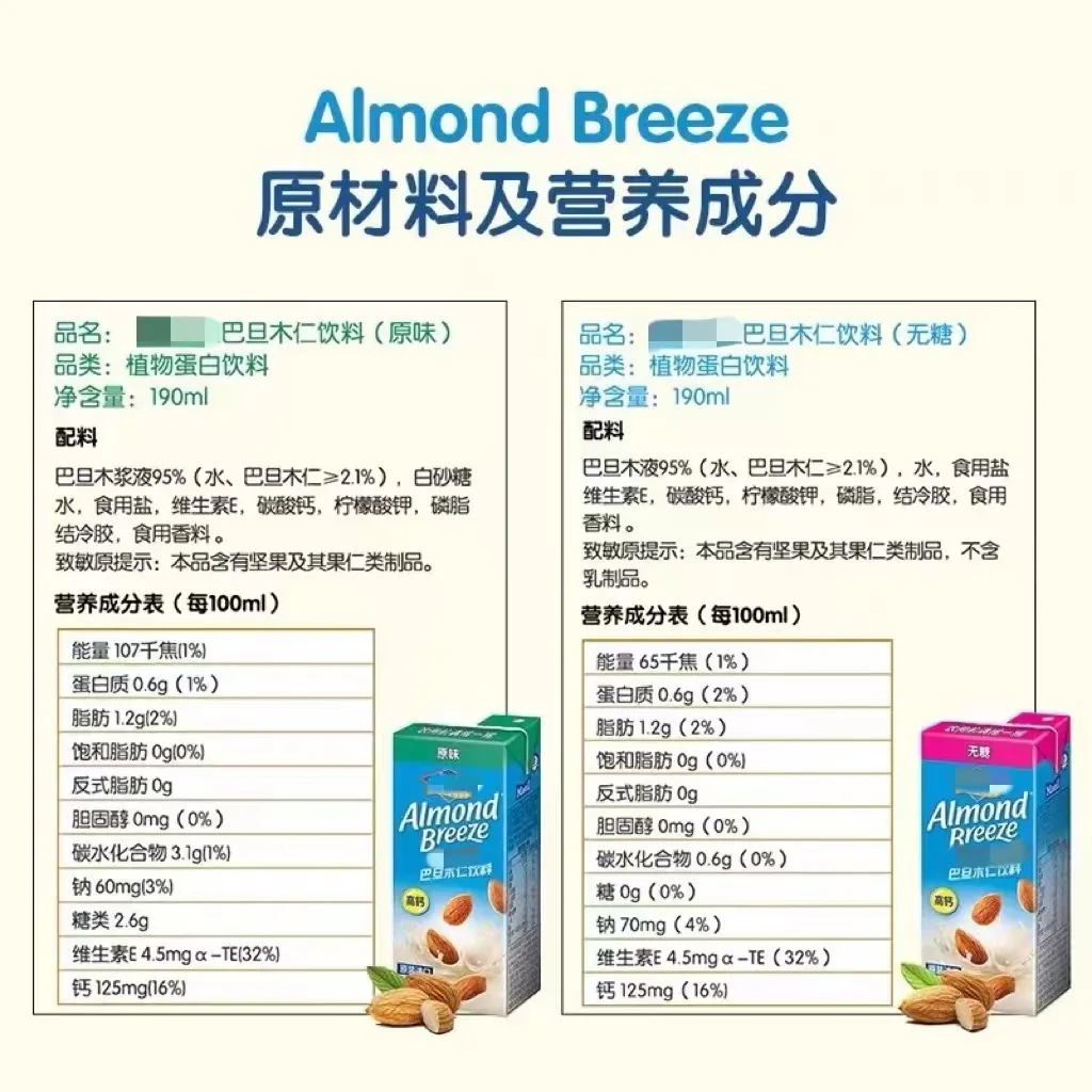 ▲大致計算了一下,按照1粒巴旦木1.3g計,100ml的巴旦木奶裏只有1粒半的巴旦木。