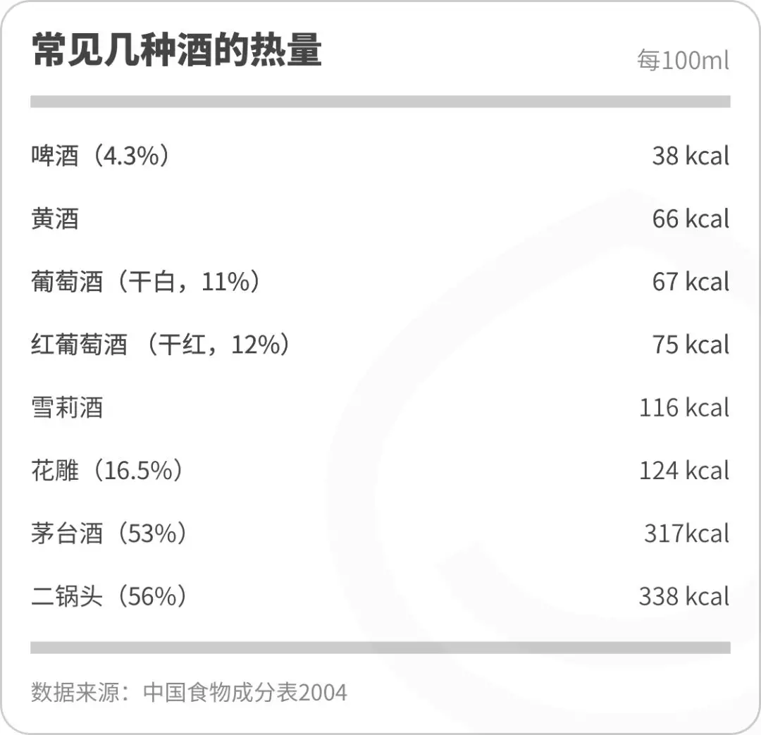 我想大多數人都不知道酒精本身有熱量,比碳水化合物還高很多:酒精的能量係數是7kcal/g,碳水化合物是4kcal/g。高度數酒的熱量比米飯還高,比如二鍋頭(58度)的熱量有351kcal/100ml。