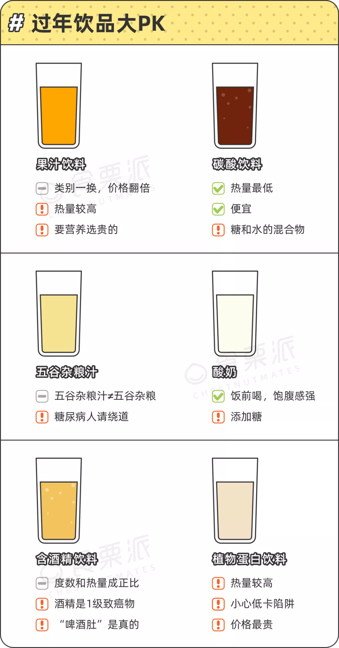 今天,小栗子就來扒一扒各種過年飲品,幫助大家選擇最適合過年喝的飲品,防止大家不知不覺喝胖、喝窮。