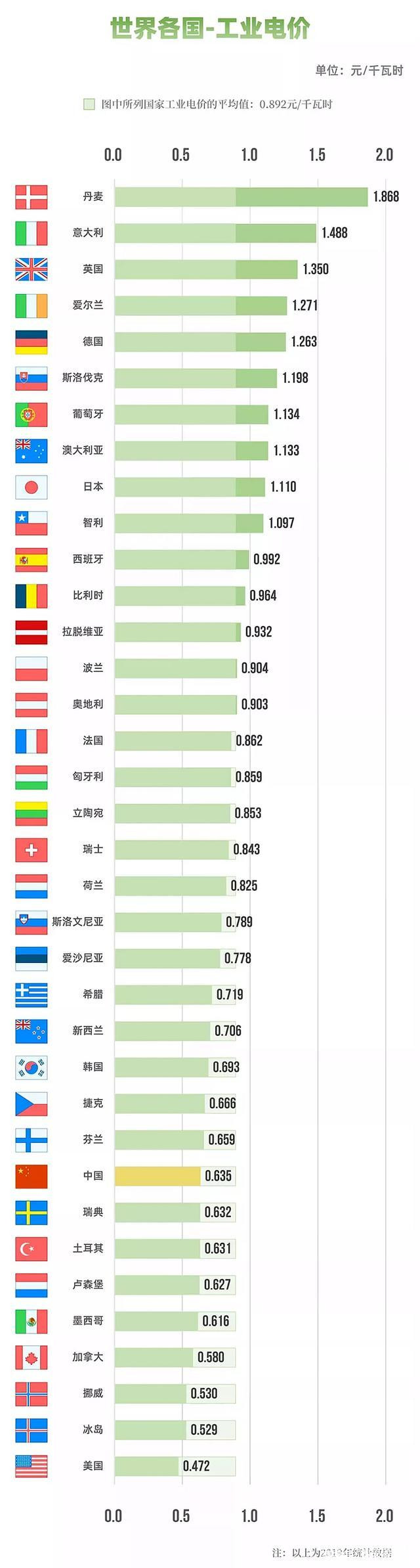 有人説:根據某經濟機構將2019年中國工業電價與經合組織中的35個成員國做了對比。數據顯示:在36個國家中,丹麥工業電價最高,平均每度電約1.868元,而排第二第三則分別是意大利和英國,美國最低,僅為0.472元/度。