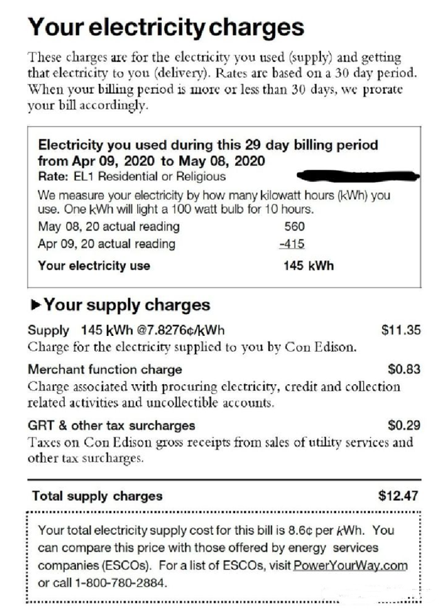 首先是電費單子的第一部分,大家可以看到她上個月用了145千瓦時,也就是145度電。每度電7.8276美分,加上一些税,總共是12.47美元。