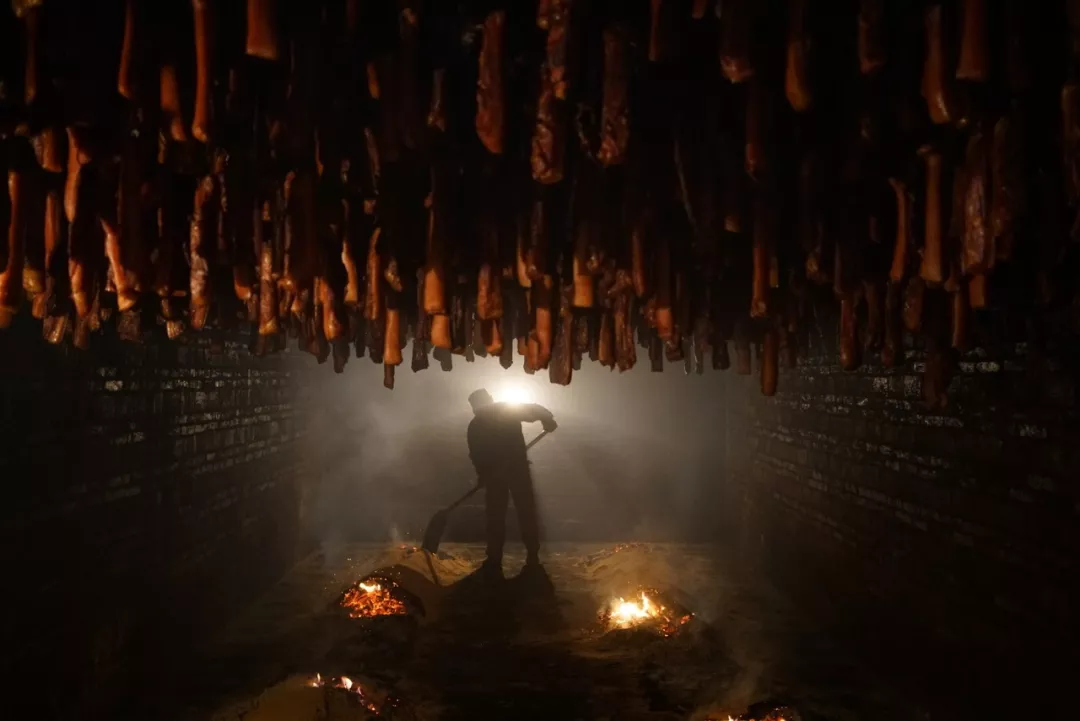 所有的臘味,都要用自貢井鹽、漢源花椒和朝天辣椒,和一勺賦予靈魂的蒸餾白酒醃製。之後進行日曬、煙燻。這是肉類熟成的過程:煙燻依賴燃燒提供的大量熱量,而日曬除了日光中的熱量,還會佐以肉內部內源酶的共同作用。它們降解了肉和辣椒中的蛋白質、脂肪、糖類,產生大量的肽、遊離氨基酸和揮發性的脂肪酸。這是大分子到小分子的轉變,也是盛產“臘味”的途徑。