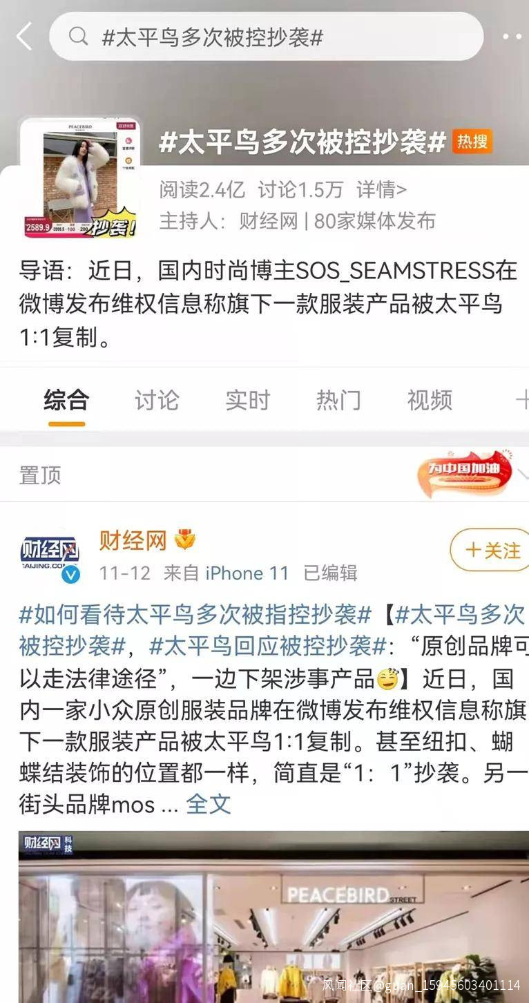 而讓人意外的是,在明晃晃的“抄襲證據”面前,太平鳥對此的回應卻是,一邊聲稱“原創品牌可以走法律途徑”,一邊火速下架涉事產品。太平鳥對待抄襲事件的“無所謂”態度也引發網友熱議,熱搜話題閲讀量高達2.4億次,討論量也突破1.5萬。