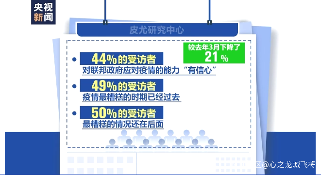 根據民調機構皮尤研究中心當地時間25日公佈最新民調結果,在1月10日至17日進行的一項民意調查中,44%的受訪者表示,他們對聯邦政府應對疫情的能力“有信心”,較去年3月下降了21個百分點。對於是否認為疫情最糟糕的時期已經過去,49%受訪者表示同意,但有高達50%的受訪者認為“最糟糕的情況還在後面”。