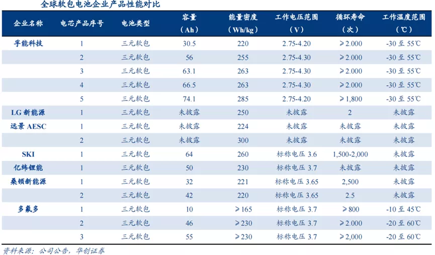 目前,國內絕大多數能量密度突破300Wh/kg大關的電池企業採用的都是軟包電池。就拿孚能科技來説,當年打入戴姆勒供應鏈靠的產品便是能量密度為285Kwh/kg的軟包電池。而彼時,其它供應商技術普遍在160-250Kwh左右。
