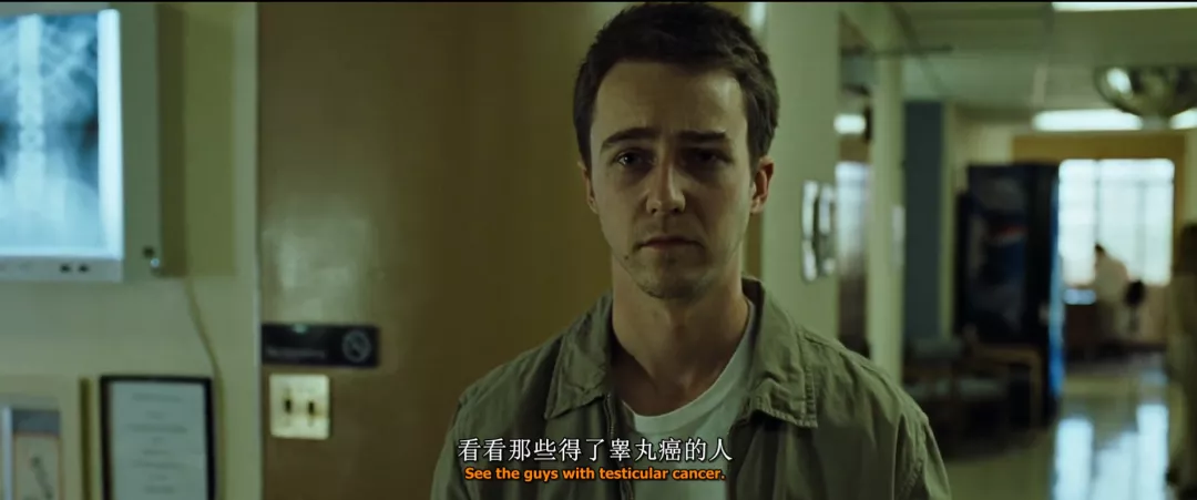這其實代表了千禧年前後,以片中愛德華諾頓為代表的一類人的困頓與掙扎。他們聽話、順從、遵循世界的規則但卻找不到人生的意義,找不到自己生活的依託,在生活中找不到真實的感覺,乃至於要去和絕症患者互相慰藉才能暫時延緩。