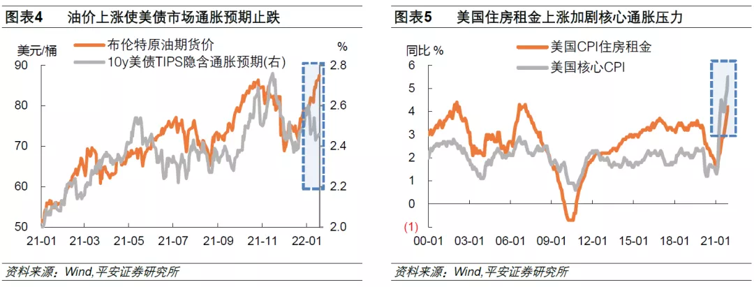 此外,我們在前期報告《當10年美債利率升破1.9%》中指出,**近期美國通脹壓力只增不減。尤其需要關注兩點:**一是,近期國際油價在美聯儲緊縮預期中“逆勢”上漲。圍繞俄羅斯、烏克蘭的地緣政治博弈升温,進一步刺激油價。美債市場的通脹預期原本因實際利率上行而有所降温,但近期因油價上行而“止跌”,使實際利率上行對美債名義利率的拉動更加明顯。二是,美國住房租金開始加速上漲,加劇美國核心通脹壓力。美國住房租金分項在美國CPI的比重達三成以上,且其滯後於美國房價的上漲,未來可能在房價壓力下持續上漲。因此,美國住房租金的上漲可能使美聯儲縮表決心更加堅定,市場或進一步預計美聯儲將盡快縮減MBS持有,為美國房價降温。