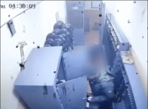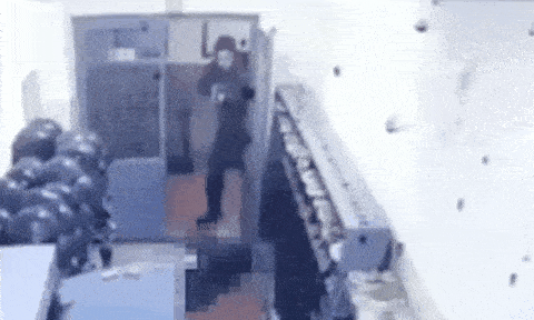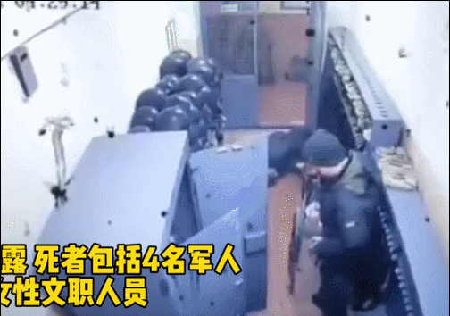 從事後曝光的監控錄像看,里亞布丘克是在換崗交接武器時拿到了AK74,然後突然就開始在武器儲藏室門口向裏射擊,擊倒兩人,在外面跑過去擊倒數人。