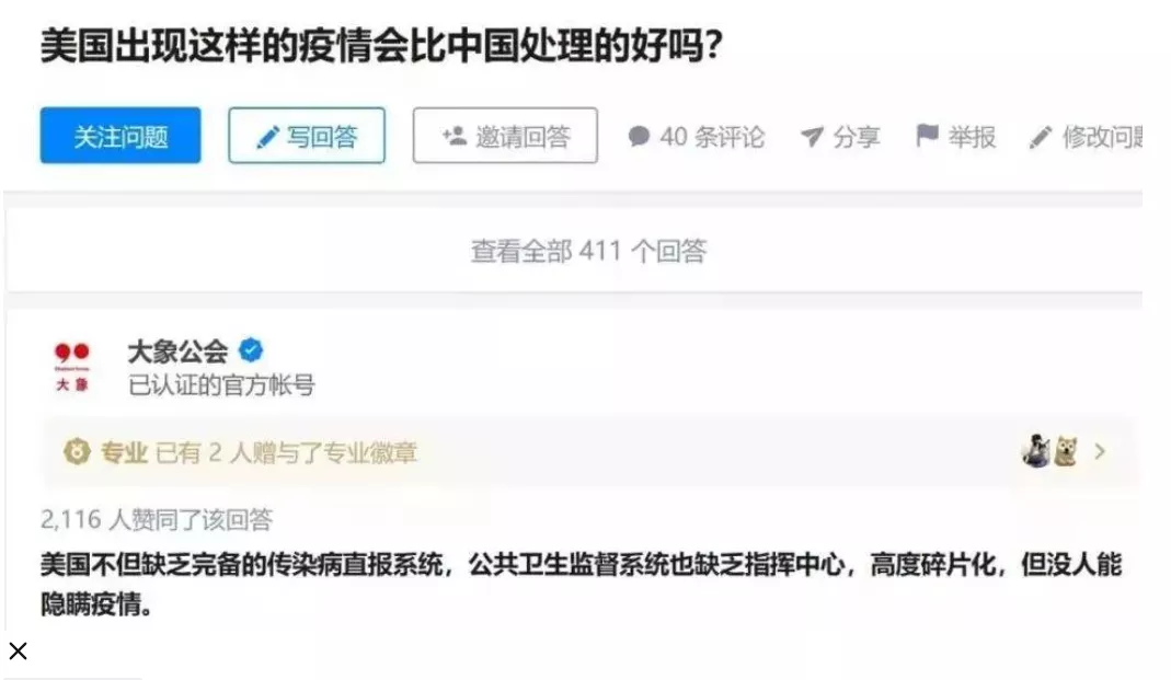著名“科普媒體”大象公會寫文章説,疫情根本不會發生在美國,因為美國沒有人敢隱瞞疫情。