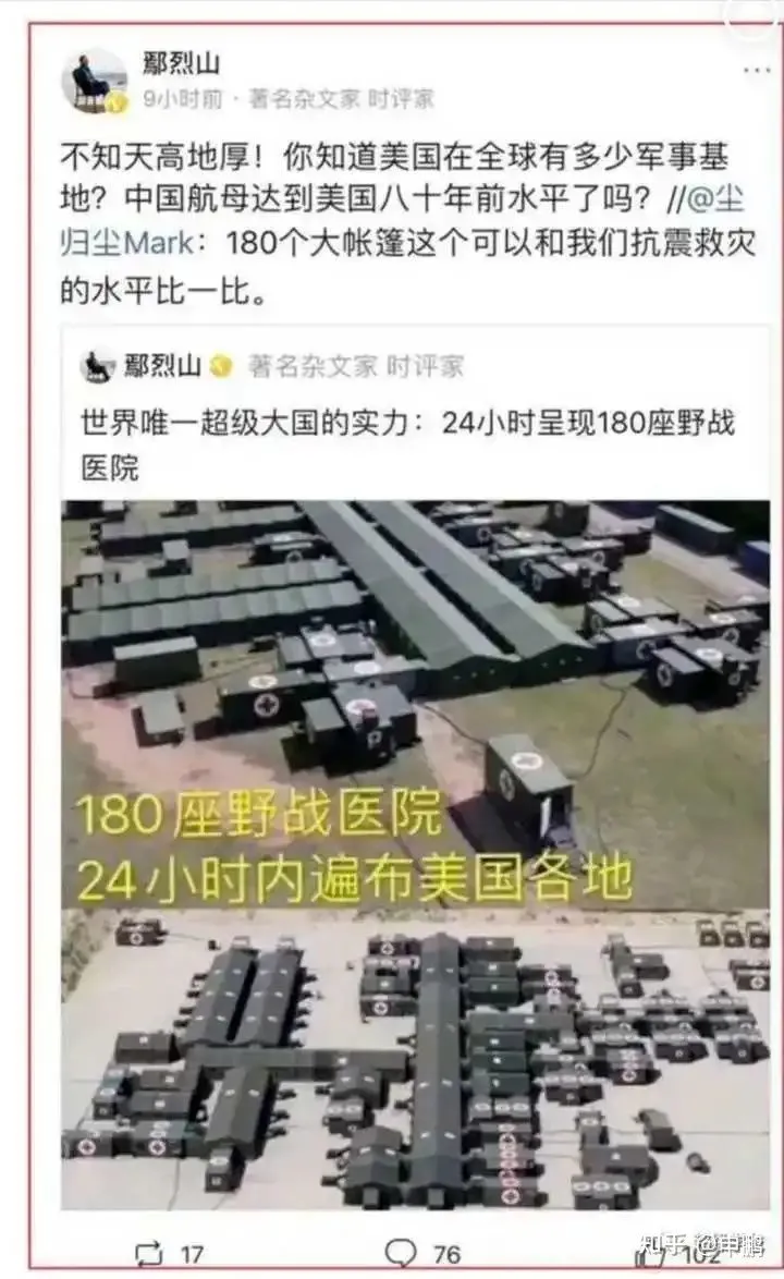 時間再往後移,美國疫情控制不住了,每天的確診人數、死亡人數像坐了火箭一樣飛竄……著名公知鄢烈山站出來説:“不要怕,美國24小時建造180個戰地醫院,你們真是不知天高地厚 ,忘了世界唯一超級大國的實力……”