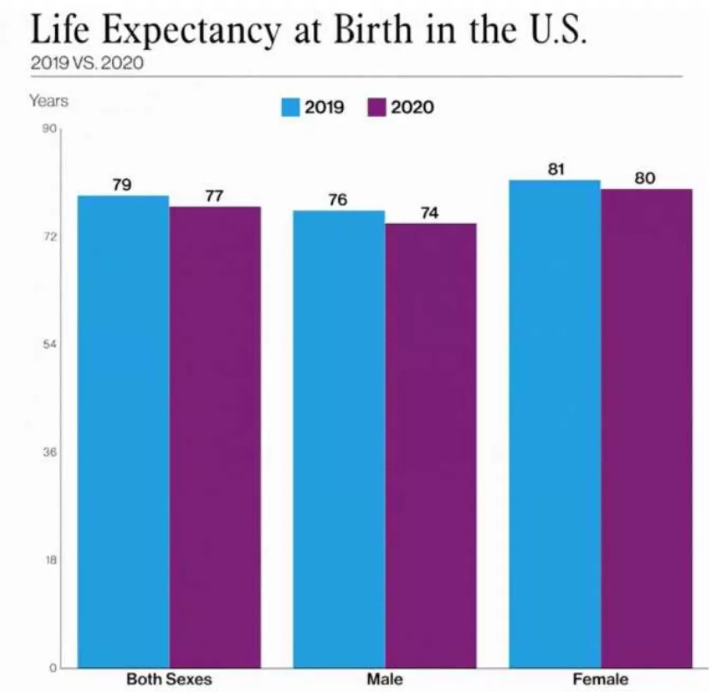 結果,美國平均壽命2020年當年就下降了一歲多。
