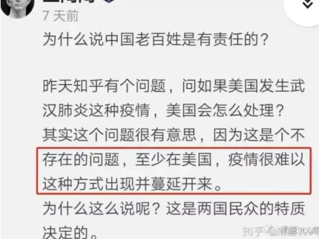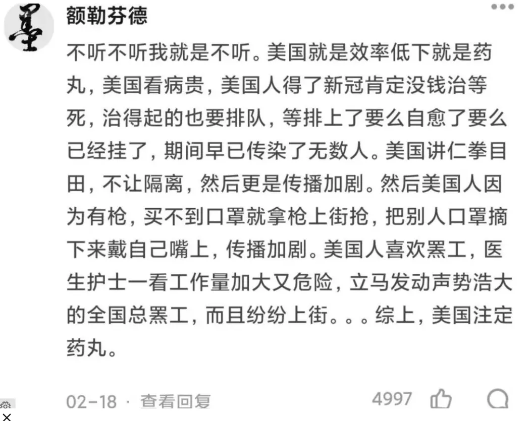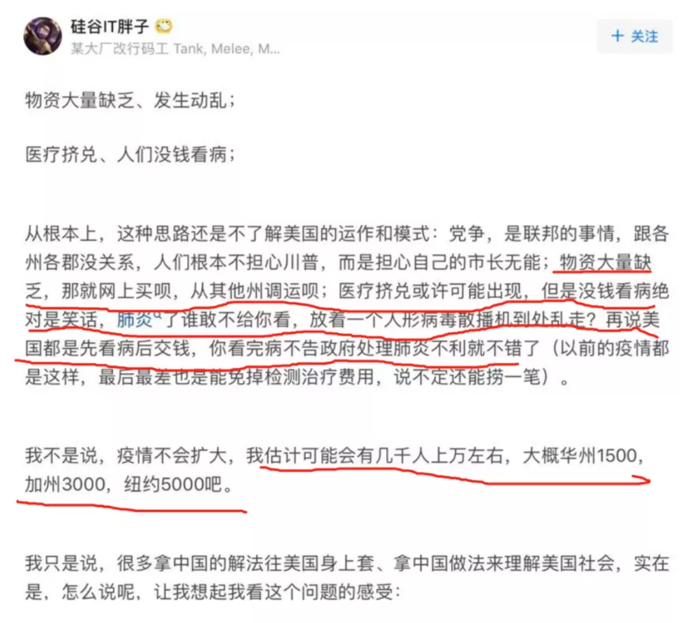 2020年2月,有人説,美國疫情絕不會這麼嚴重,美國絕不會死這麼多人,他們嘲笑“你們擅長解決別人不存在的問題”。北美著名華裔碼農“硅谷IT胖子”説——“美國怎麼可能沒錢看病?美國怎麼可能物資不足?美國怎麼可能放任病毒傳播?頂多感染幾千上萬人,不要拿中國的解法往美國身上套!”