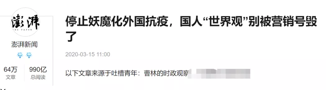 我國著名大報記者曹林,寫了篇雄文,叫做《不要妖魔化國外抗疫》。