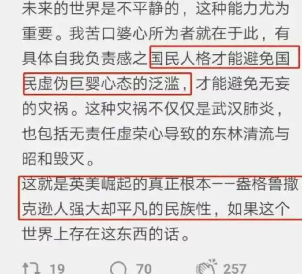 著名昂撒民族性學者王先生説:“在美國,(疫情)就是個不存在問題,至少不會像這樣蔓延開來,有具體責任感的國民人格才能避免虛偽巨嬰心態的泛濫…..你要相信盎格魯-撒克遜民族偉大而平凡的民族性。”