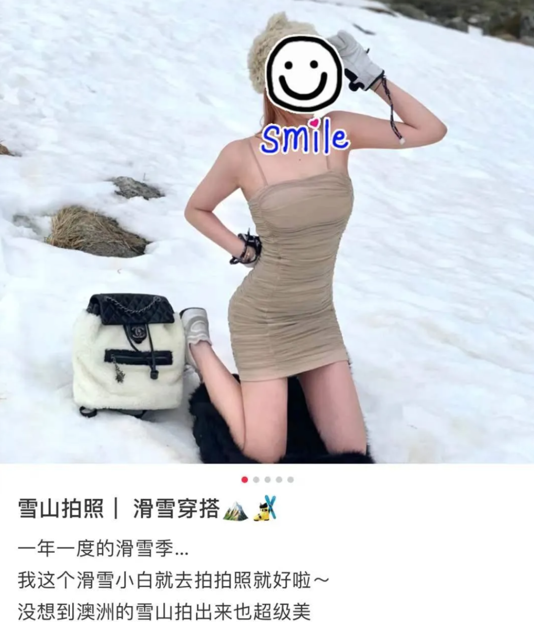 更有甚者,直接超短裙,跪在香奈兒包包旁邊,和背後的澳洲大雪形成強反差。
