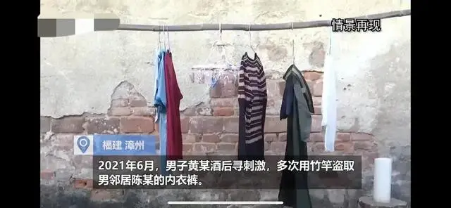 據《檢察日報》,2021年6月,福建漳州一男子黃某酒後尋刺激,多次用竹竿盜取男鄰居陳某的內衣褲。