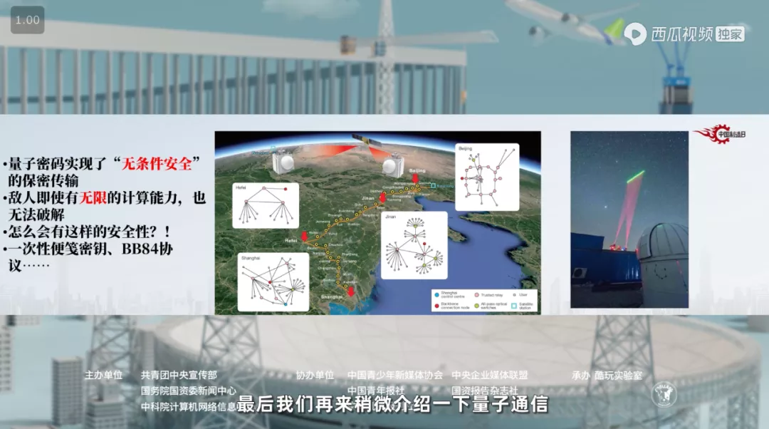 可以告訴大家的是,中國在這個量子密碼這方面毫無疑問是世界領先的。2016年我們發射了世界上第一顆量子科學實驗衞星“墨子號”,2017年我們開通世界上第一條量子保密通信骨幹網“京滬幹線”,從北京到上海2000公里的距離上都可以實現量子保密通信。而且兩者連起來了,他們實現了天地一體化的量子通信網絡。實際上我們曾經把它連到歐洲去,實現了中科院院長白春禮院士和奧地利科學院院長安東·塞林格之間的洲際量子保密通話。